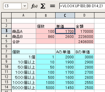 1個なら2000円だけど100個以上なら1700円、500個以上なら1500円に割り引きます、といった時にはlookup関数を使うのがいいでしょう。