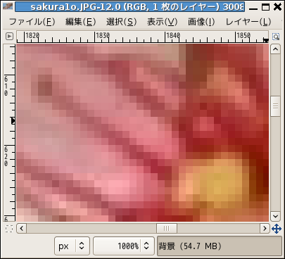 差は歴然です。300pxの拡大の方はタイルのように四角が見えていますが、これがひとつのピクセルです。3008pxの画像も同じ程度拡大するとやはりピクセルが見えてきます。