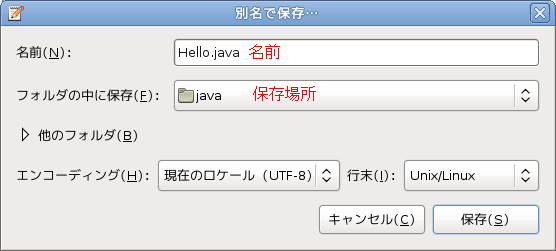で保存します。保存の時には「名前」だけでなく「保存場所」が大切。[プログラミング]-[Java]で開いたエディタなら黙っていてもjavaというフォルダに保存されるはずですが,「フォルダの中に保存」の所に「java」とあるのを確認してください。名前には「Hello.java」と入力して保存します。LinuxではそしてJavaプログラムでは大文字・小文字の区別をしますから慣れるまでは特に注意。